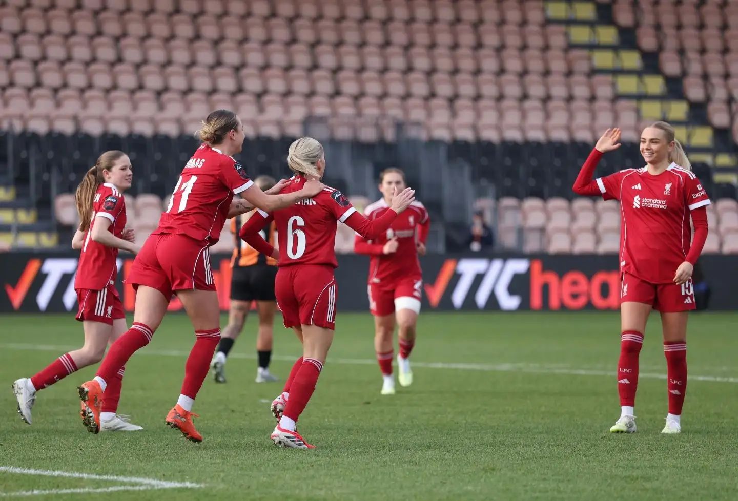 Enderby kemudian membuka peluang untuk keunggulan The Reds Women setelah memperpanjang penguasaan bola, Bernabe memainkan bola ke kotak pinalti lawan, dan Thomas dengan sundulan yang cerdas merubah skor menjadi 3-0 untuk keunggulan The Reds Women hingga babak pertama selesai.
