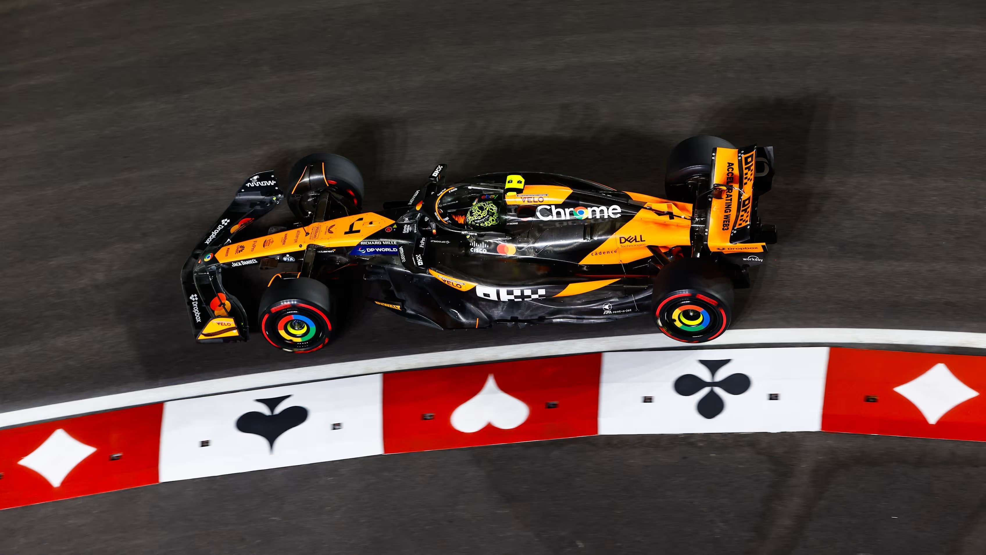 Mobil pembalap McLaren, Lando Norris, saat beraksi di Sirkuit Las Vegas Strip, Nevada, Amerika Serikat. (Foto: formula1.com)
